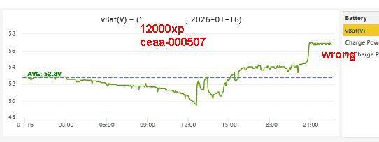 ...I really need to see a fix that results in a LFP-friendly charge for generic open-loop charge control by voltage that results in the desired CC-CV charge curve. I expect to see battery voltage rise to some Vend-of-charge (56-59v), and then relax to Vfloat (53-54v).