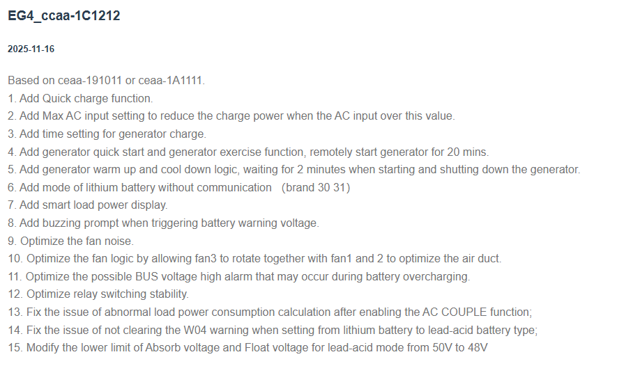 I just added a third inverter 6000xp to my set up. while doing so I updated all three parallel inverters to this 1C1212. I now have wild fluctuations in my battery voltage readout-55v to 57.5v. This oscillation is milli seconds apart. I have it set at 57.1 v absorb and 57 float with lead acid batts. I have noticed this with the first two inverters when first setting parameters. After a day or so the settled down and worked fine. Is this something these inverters do normally? Like learn where they need to be with each other? And will these three settle down, Eric EG4 will you weigh in on this?
