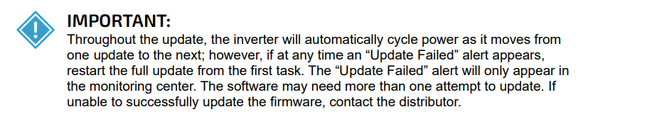 Throughout the update, the inverter will automatically cycle power as it moves from one update to the next.