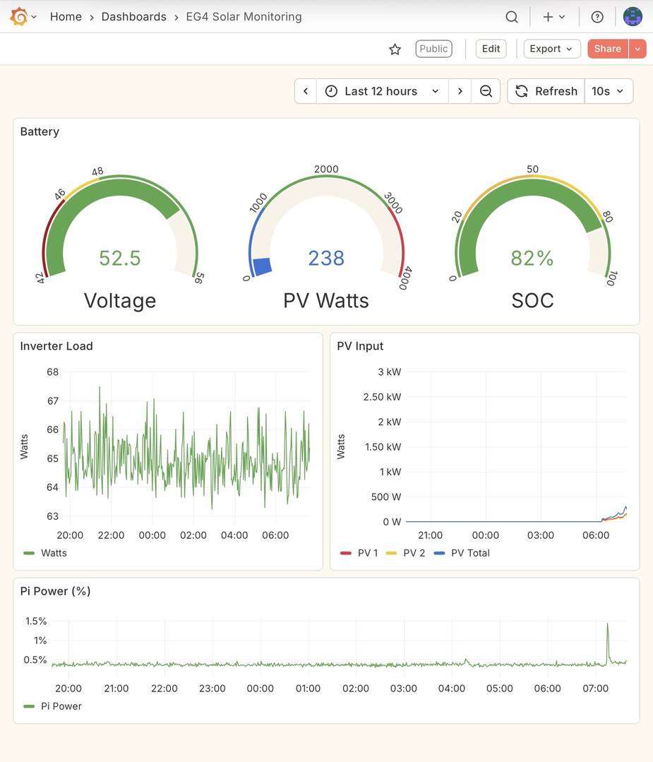 I’ve always wanted to try my hand at Linux programming and getting a Raspberry Pi to talk to Solar Assistant and feed information into Grafana. This journey has resulted in my own monitoring page.