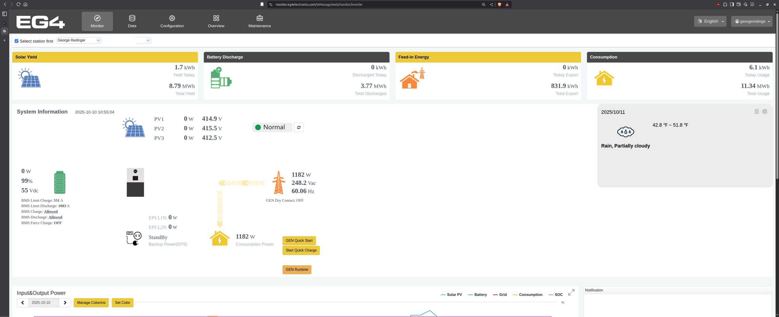 The EG4 monitor screen screen shot shows current operation, loads supplied from grid, battery is full.
