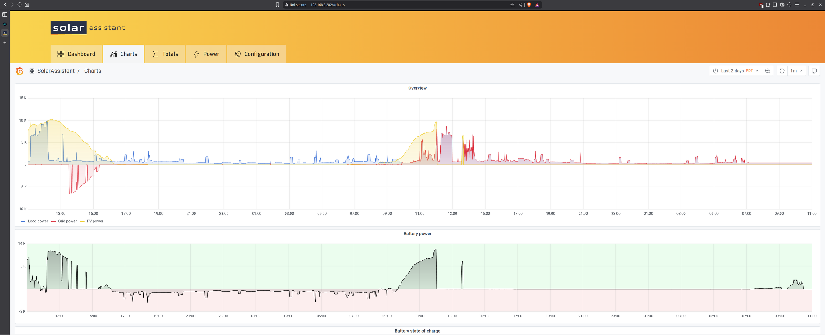 Disconnected solar-assistant so I could use the EG4 WiFi/web app. (using MODbus connection from 18kPV to an orangePI , which will not operate with the EG4 WiFi dongle plugged in)