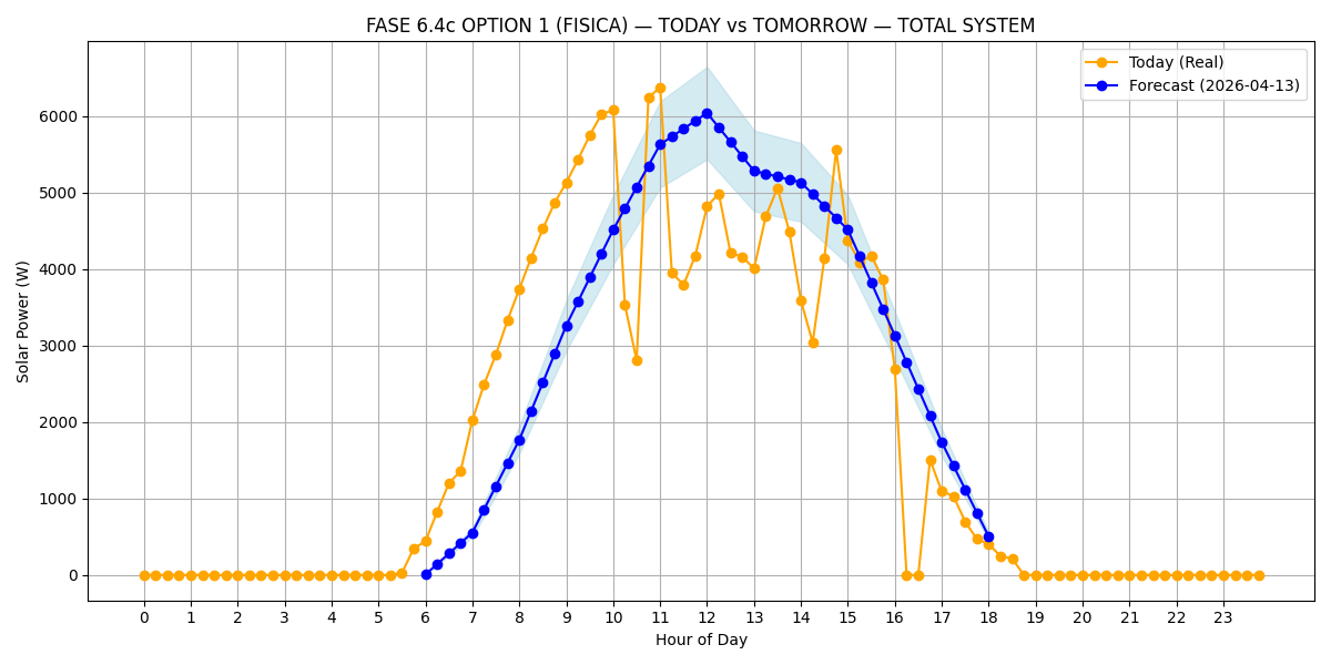 The output is a triple-curve forecast generated nightly: actual production (orange), ideal clear-sky potential (dotted bell), and a realistic prediction adjusted for every cloud in tomorrow's weather model (blue). The accuracy has been remarkably precise.