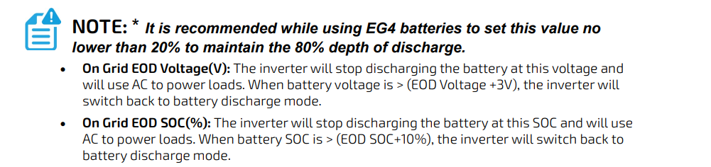 What is the 10% based on? Once it switches from one mode to the next, changing settings has no effect (maybe until the next transition); how does that work (i.e. sequence)? The LCD display shows PV/Batt/Grid/On or PV/Batt/Grid/Off; is On/Off the bypass mode? How do schedules interact with the transitions? How are other settings interacting with transitions? A ladder diagram or sequence of operation might be helpful.