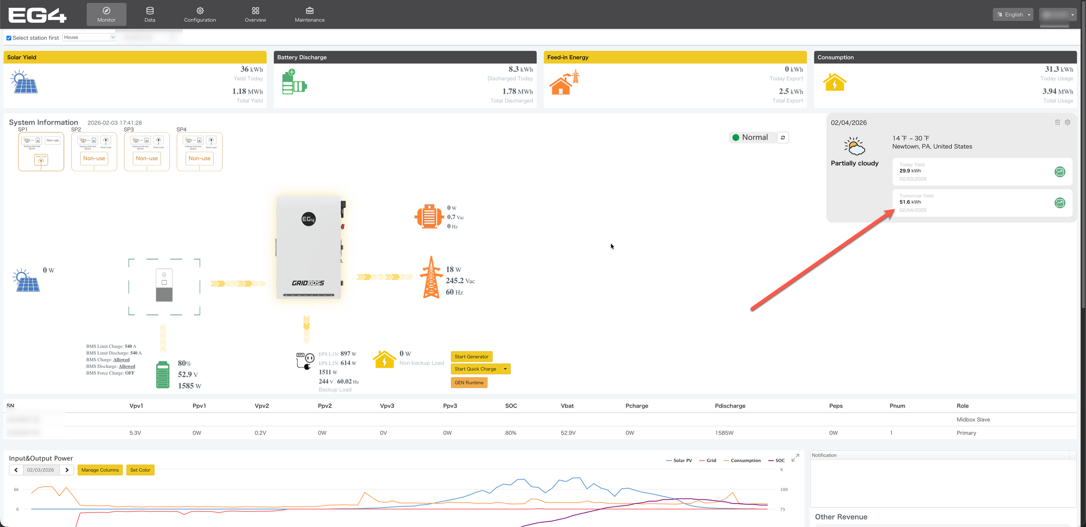On the Monitor homepage, today is shown as partly cloudy and tomorrow is clear with an estimated yield almost 2x today’s production. That lines up with what I’m seeing from Weather.com and other forecasts (I’ll attach screenshots).