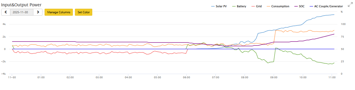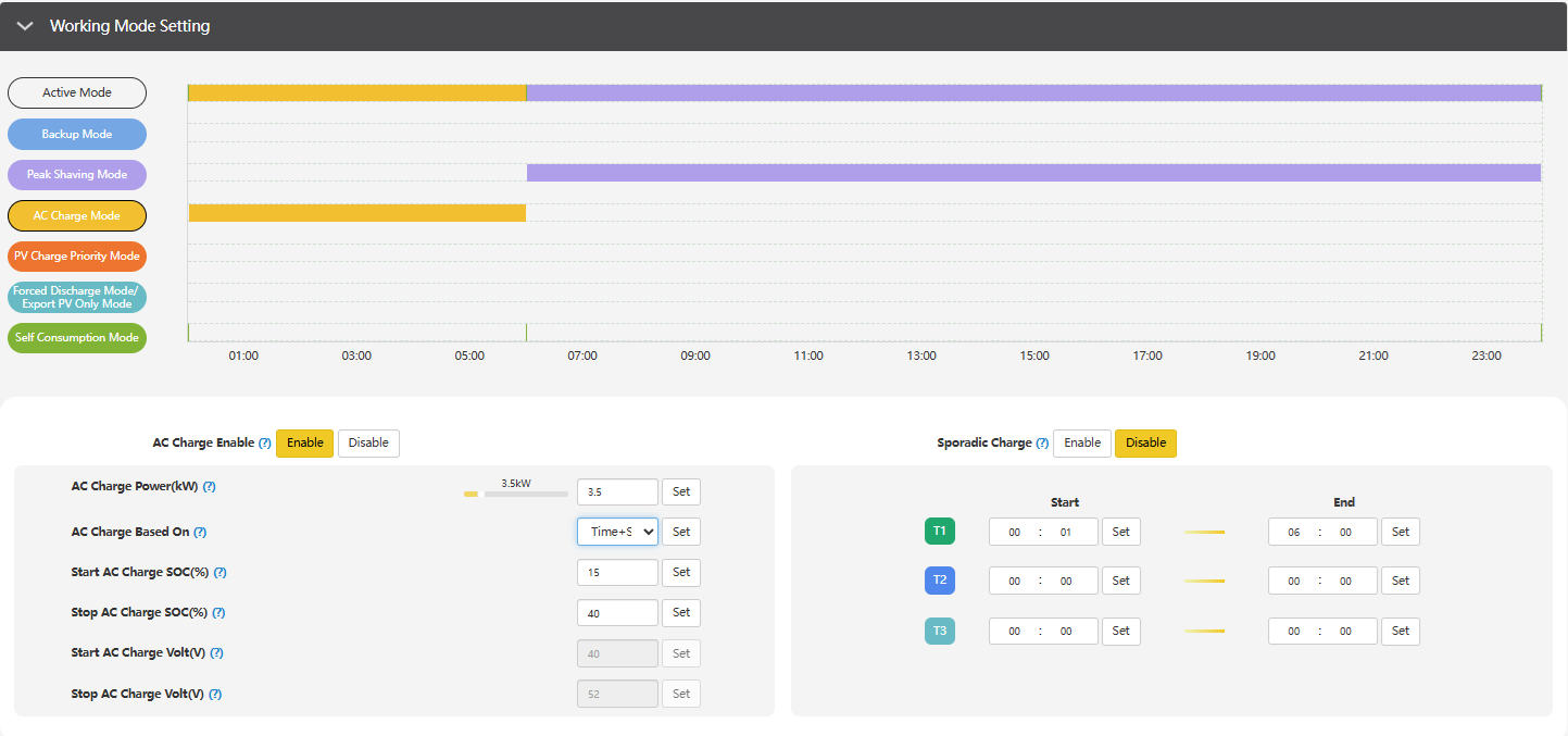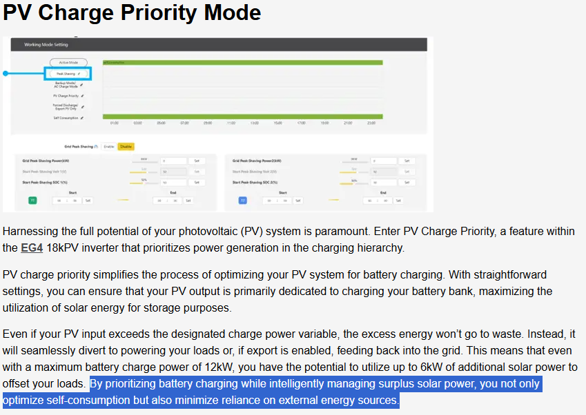Switching the "AC Charge Based On" setting to "SOC/Volt" does allow using the battery in this window but the charging will happen outside of the AC Charge window. The only way to prevent this is to set "Peak Saving Mode" to prevent charging over the entire remaining Working mode as shown in the graph below.