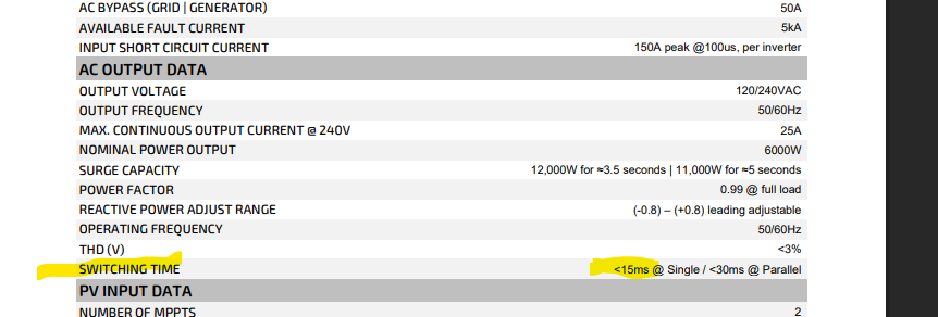 Additional consideration is that as I noted in top post, the charge control is being handled by the 6000xp in an "open-loop" configuration by voltage setpoints with parameters as required for open loop charging of LFP. I suspect that the charge control has some flaw in the firmware logic and is not handling the change from the final stage of CV charge to reduce PV and drop to float gracefully.
