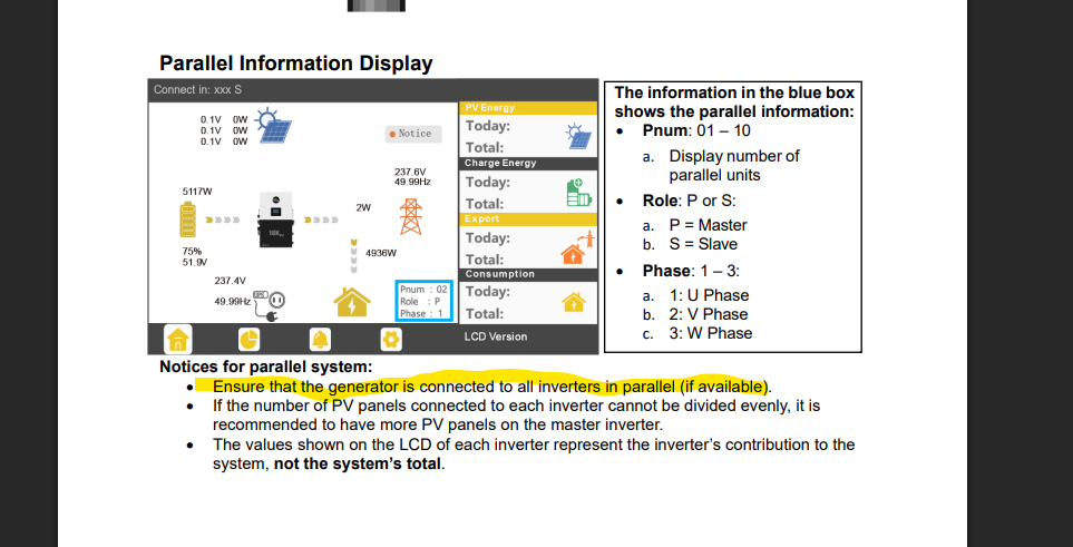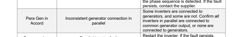 After putting the generator in Auto mode and turning the Main Breaker On, all 3 inverters have the fault "Para Gen unAccord”