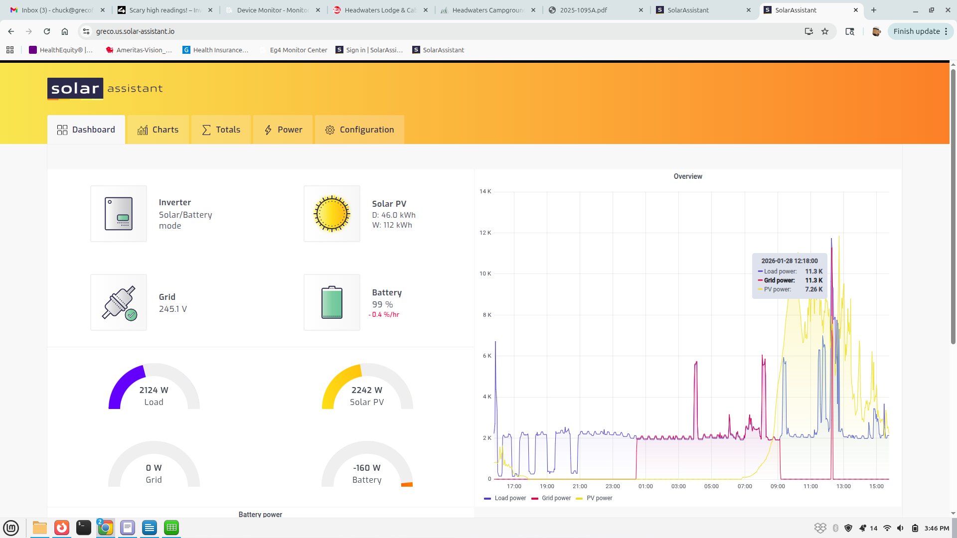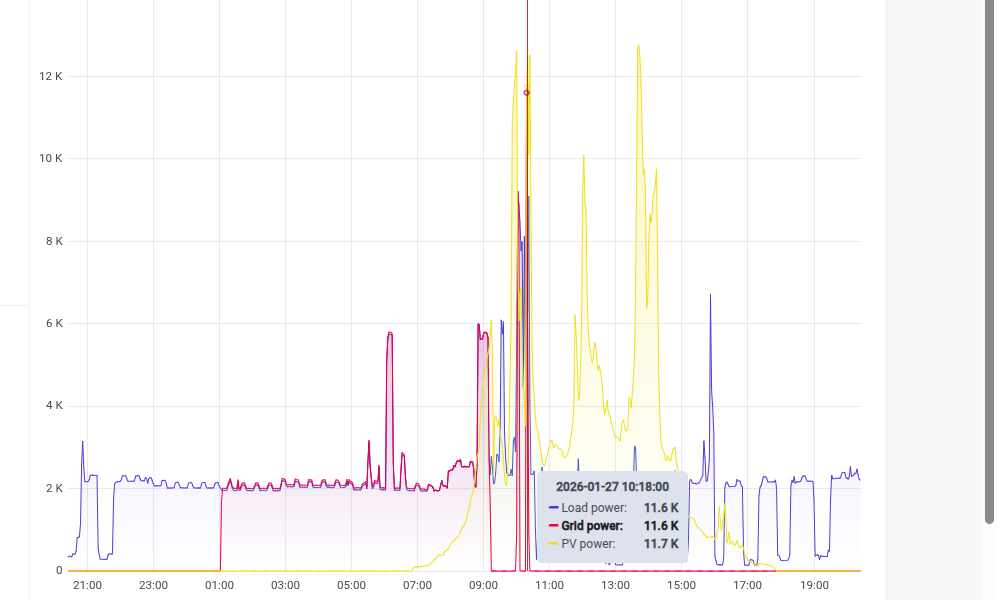 My system is pretty new, only been operating since the end of December. So I tend to keep an eye on my solar input and battery level ... a bit too much probably. I have a 12000XP, 6 Eco-Worthy 48v 100ah rack mount batteries, and 12.6 kW of solar. Today, while running off of the batteries, I was shocked to check and see my load was at 12k. I'm uploading screenshots from 2 sources, EG4 app and Solar Assistant. I know I could get to 12k with my big draw items in my house, if everything was on at once. But at this time, for about 20-30 seconds that I saw these readings, the ONLY thing running was the clothes dryer. (yea, might have been a freezer or fridge running, and a few LED lights) I'm assuming this was some sort of glitch, and was wondering if anyone has had it happen to them? Any insight would be appreciated.