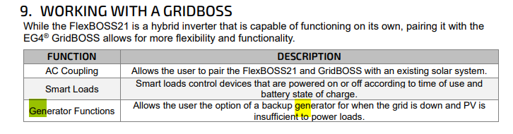 My understand (and I could be wrong) is that you need a grid boss paired with the Flexboss to get gen functionality.