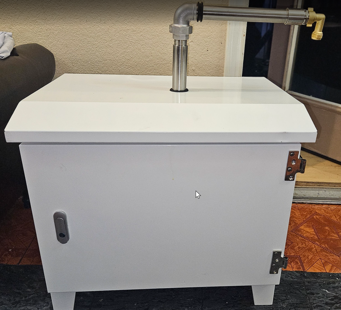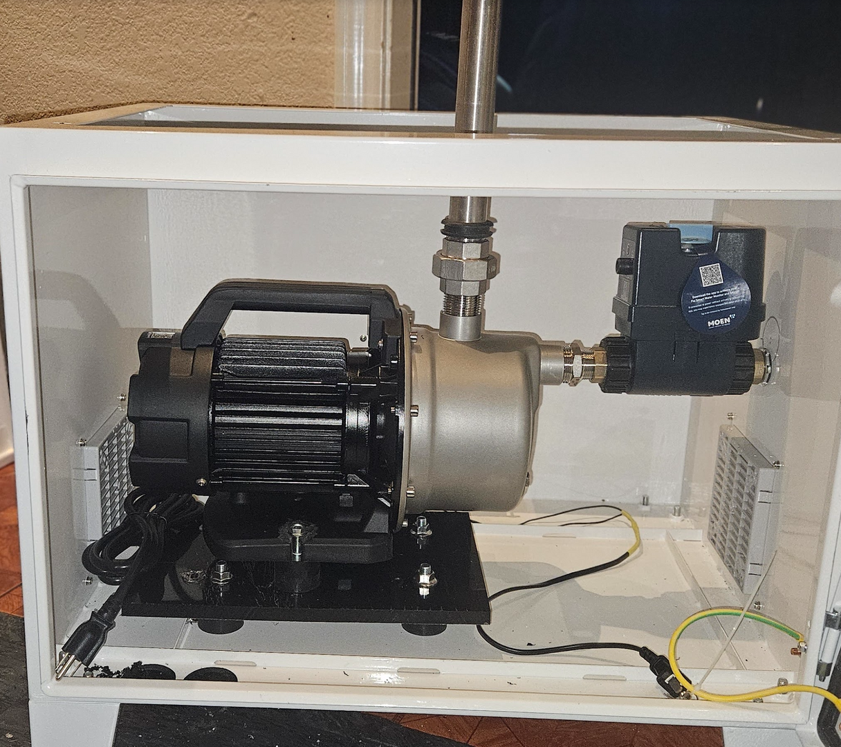 I also found a cabinet to keep the pump and valve out of the wind. I also mounted it on rubber feet (noise was unreal). As a final move i wrapped the heating tape from last year around the pump and valve (yeah, its ugly, but it works! I think 100 ft is a bit too long 😉 ). I have been through a couple of freezes already and it seems sound. Only time will tell.