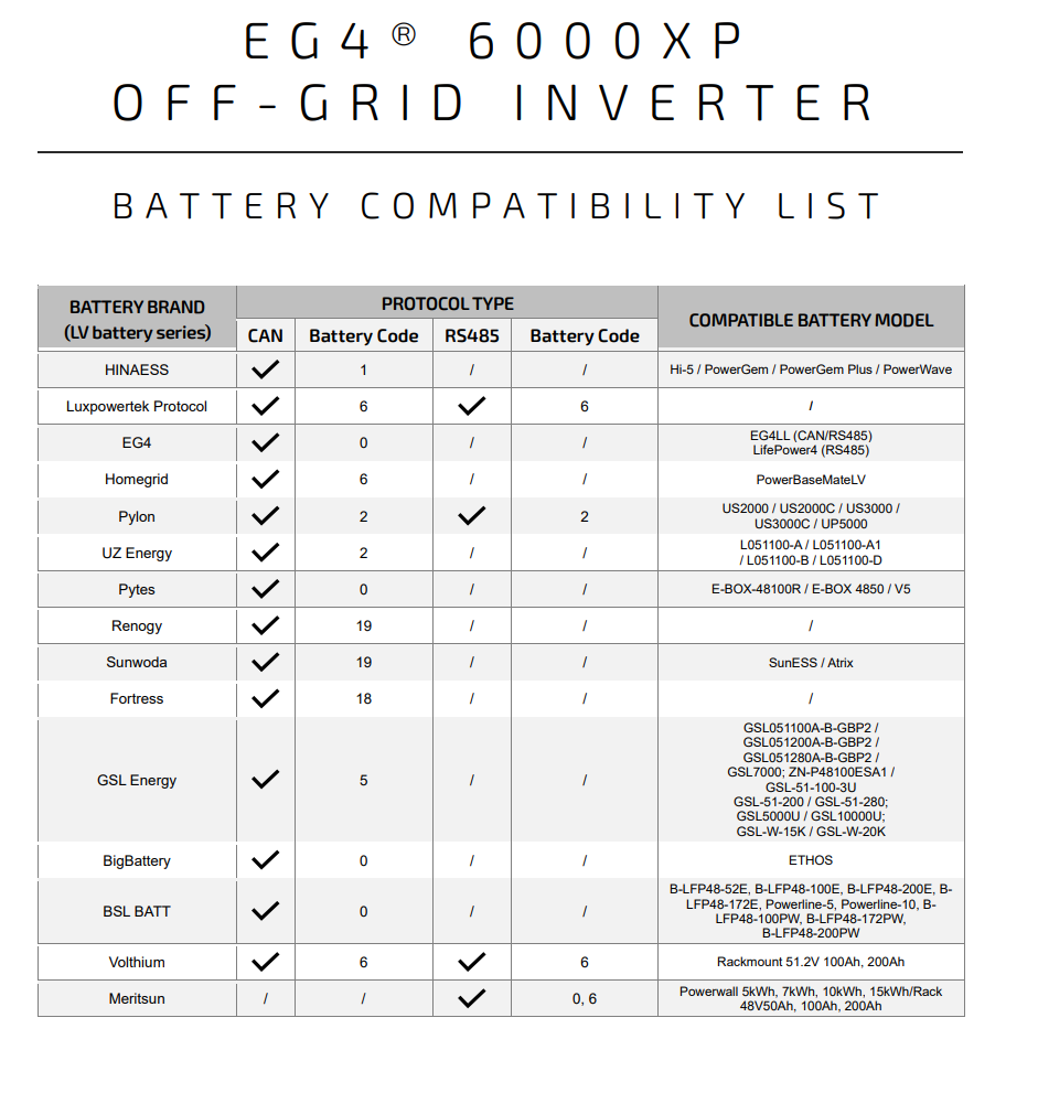 Ruixu batteries are set to “Luxpower” for inverter type. I have tried setting the 12000XP to “00 - General lithium” battery type, but get a warning 04 - that it can’t communicate. I’ve also tried 08 - Luxpower with the same thing. Ruixu has said these two (or one of the two) should work.