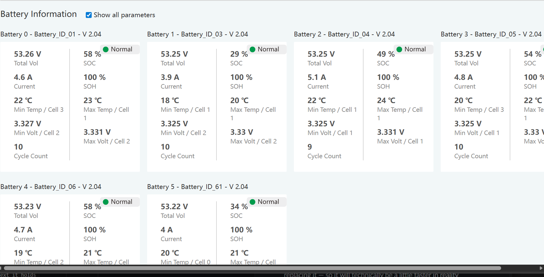 Okay. I get way more information on the desktop site. It looks like while the voltages are all very close the SOC is widely different between the batteries. My understanding, which could be wrong, is that the system is designed to balance the batteries automatically. I.E. Lower batteries will get more current to try and balance out. I've got the battery cables as balanced as feasible. Is this something that will resolve itself or do I need to take some corrective action to get those two batteries with the low SOC to get in line with the other ones because I think this is what caused the problems. Those two batteries went off line and didn't go back online until I power cycled them... at which point they started charging again but had fallen behind the others since the system had taken them down due to low voltage, but it was still charging the other 4 batteries.