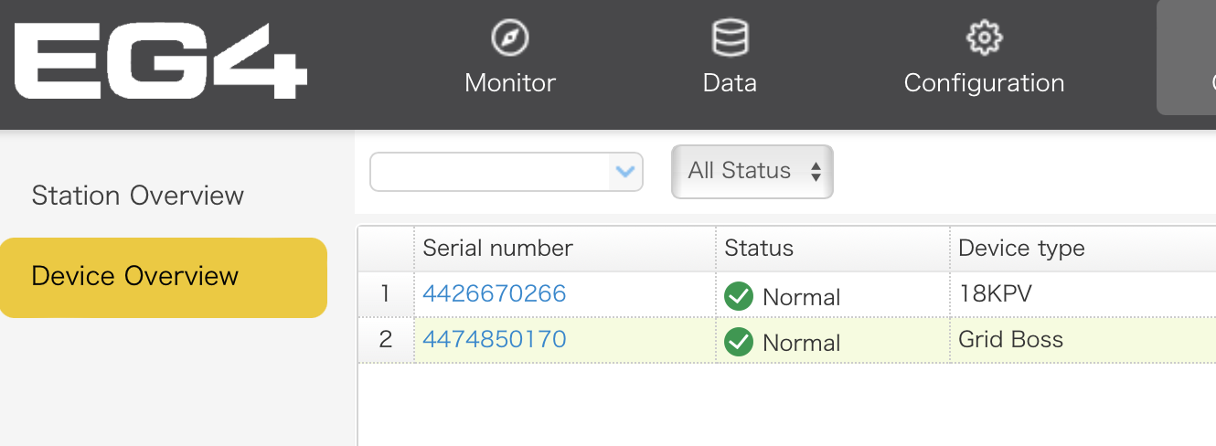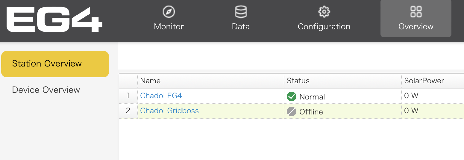 In the web monitor app, Gridboss is 'Normal' in the 'device overview', but it is 'offline' in the 'Station overview'.