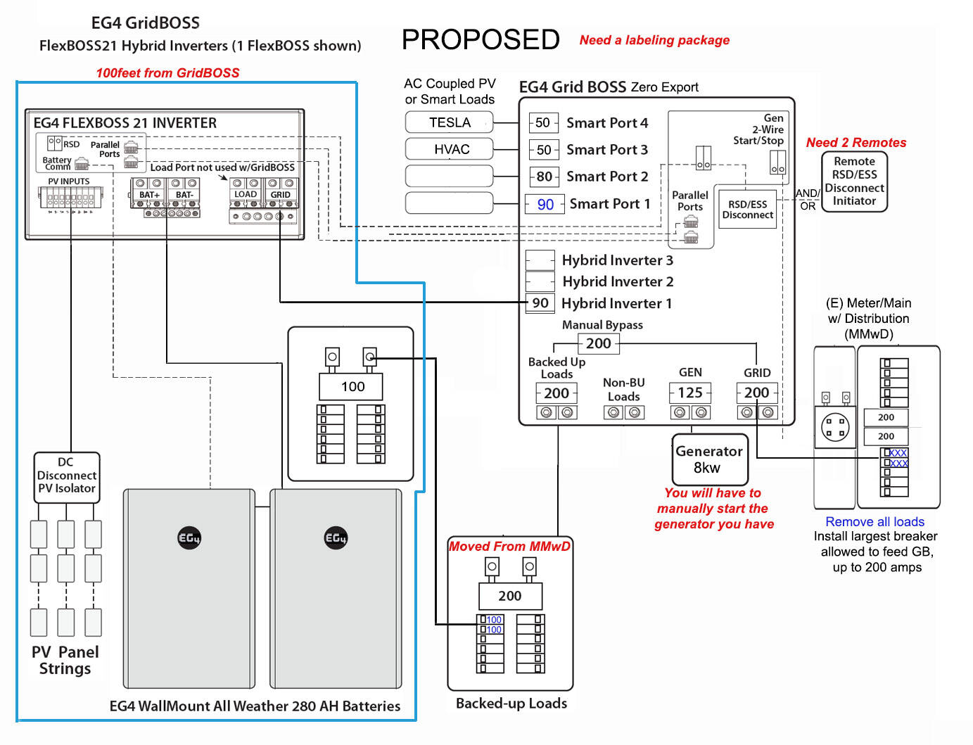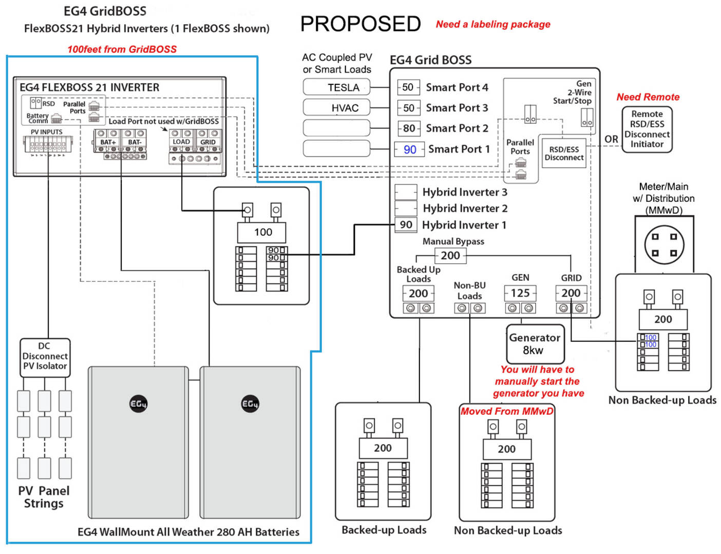 There are two conduit runs to the shop, one 2” for power, one 1” for communications. We are trying to NOT have to add a new conduit to what is already there. I have hopefully uploaded the proposed connection, though I left the EG4 verbiage to NOT connect to the load of the FlexBOSS.