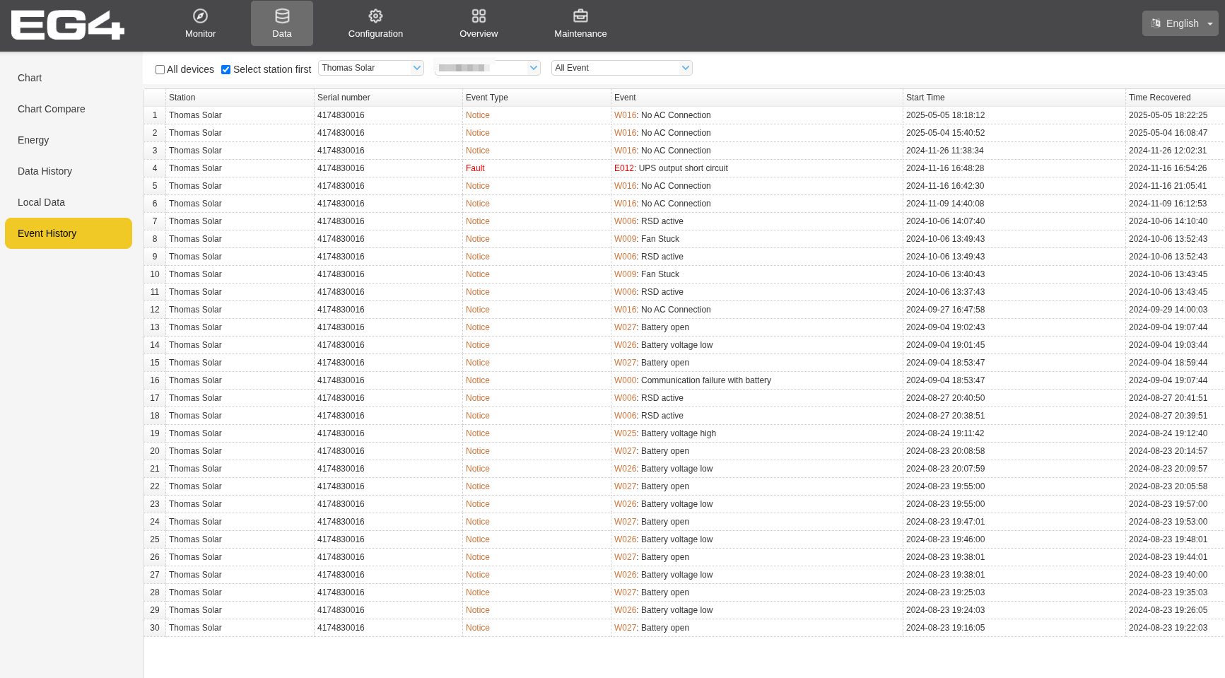 Again, there is no information on the monitor site's Event History that my inverter lost grid power: