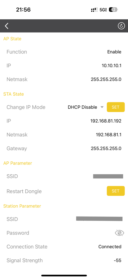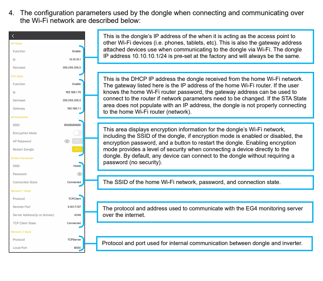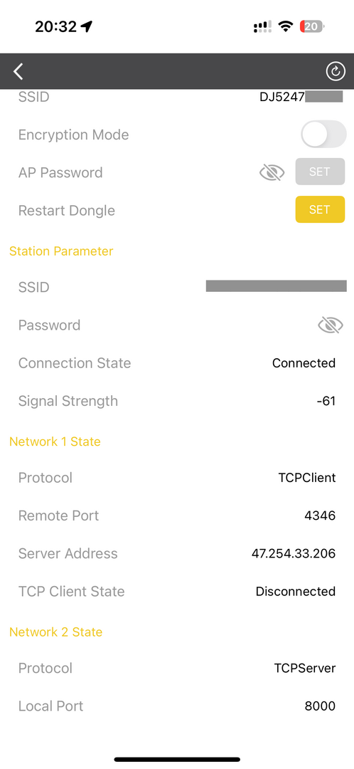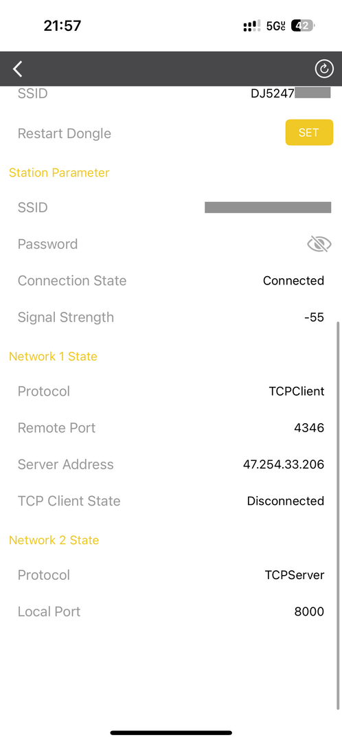 My setup is: 2.4 ghz network, no special characters in wifi name or password, SSID less than 19 characters, password less than 25 characters. Have tried literally 50 times to get it to connect to the cloud using both TCP and Bluetooth connections with no luck. Run port scan and confirmed dongle is listening on port 8000. Able to ping/telnet to EG4 server at 47.254.33.206:8000 from other devices on network.